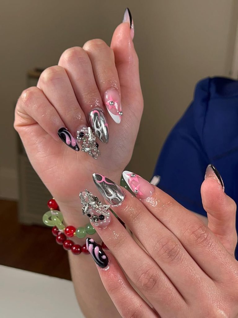 This set takes classic pink and gives it a daring twist with black flames, silver chrome, and a mix of bold embellishments. It’s equal parts sweet and rebellious — the kind of design that turns heads and shows off your personality in a heartbeat.