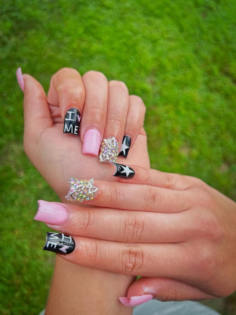 These nails juxtapose playful pink tones with aggressive black designs, creating a high-contrast, fun, and edgily feeling appearance. White letters and stars embellish the black nails, whereas the pink ones are soft and feminine. Throw some oversized rhinestone butterflies in there, and you’ve got a look that is confident and full of attitude.