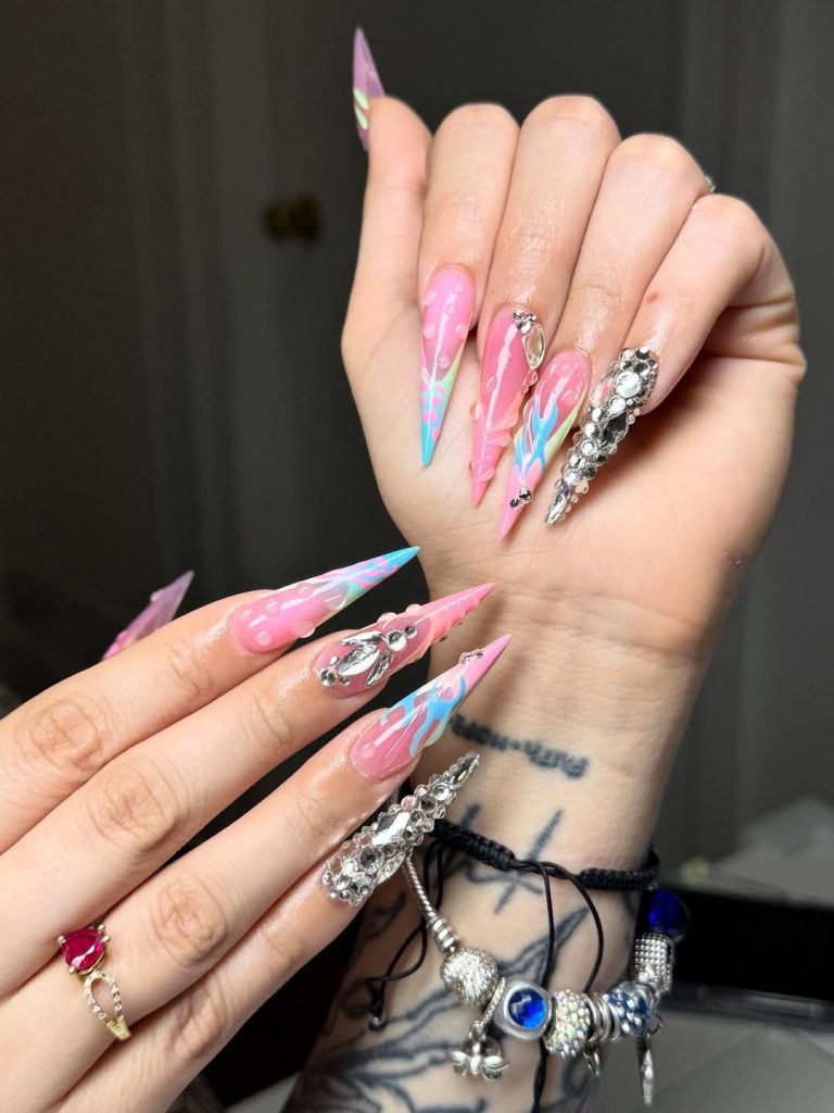 These long stiletto nails are perfect for those who love colorful pink inspo and aren’t afraid of going all out. The mix of shapes and textures makes them a statement piece, ideal for special occasions or just turning everyday into something fabulous. A strong gel base is key to holding all these adorable elements in place.