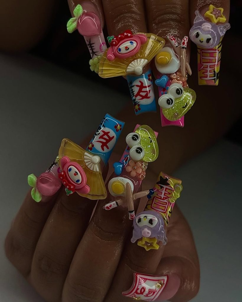 Think nails-as-a-playful-toy-box come to life. Bright colored characters, fans, hearts, and cute details all over every nail create an elaborate and unexpected 3D scene. The kaleidoscope of colors and whimsical shapes make these nails so memorable-a real conversation starter.