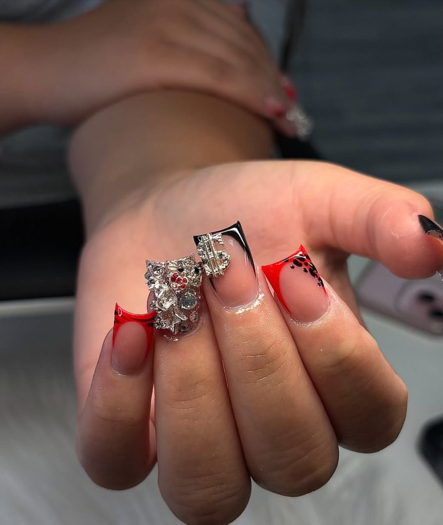 This one will turn upside down on the original French tip with red and black accents paired with loud silver bling. The smooth lines and the heavy pounding from glitter give it a tough and self-confident edge. It’s a look that feels classy and daring at the same time, perfect for those who want to stand out.