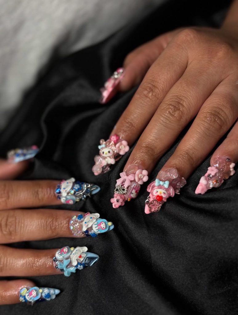 These nails look like a toy collection come to life. Adorned with cute characters, bows, flowers, and colorful gems, the nails mix pastel pink and blue for a whimsical, nostalgic feel. It is fun and maximally expressive, perfect for anyone who wants their nails to tell a story.