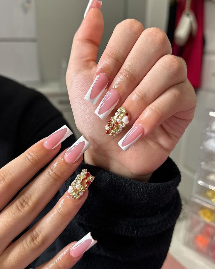 A timeless French tip is given a luxurious upgrade with gold and red embellishments. The crisp white V-shaped tips keep things elegant, while the bold gold 3D accents on select nails add a glamorous twist. It’s the perfect balance between classic and statement.