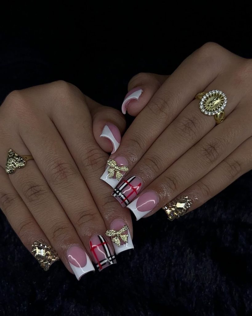 This manicure takes junk nails in a slightly more polished direction. The base is classic with a French tip twist, elevated by bold plaid patterns and gold bows that feel luxurious yet playful. It’s a balance of cute inspo and classy designs, giving off holiday-ready vibes but wearable any time of year. The combination of white, red, and gold feels rich without being overwhelming.