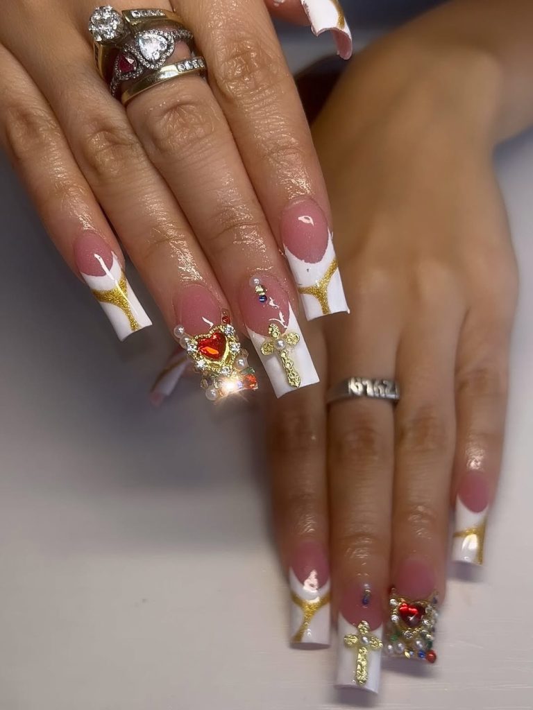 This look is drama, confidence, and glam rolled into one set. White and gold French tips set the stage for dazzling red heart gems, gold crosses, and multicolor rhinestones. They’re not just nails—they’re accessories that catch the light and demand attention. The balance of religious symbolism and playful sparkle makes them one-of-a-kind, leaning into the idea of junk nails as true fashion statements.