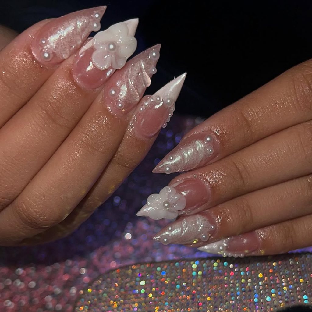 Delicate yet dramatic, these junk nails bring together shimmering pearlescent white with 3D floral appliqués and tiny pearl accents. The pointed shape makes them feel edgy, but the flower detailing softens the look into something dreamy and feminine. It’s like wedding vibes reimagined with a bold twist, making them both romantic and powerful at the same time.