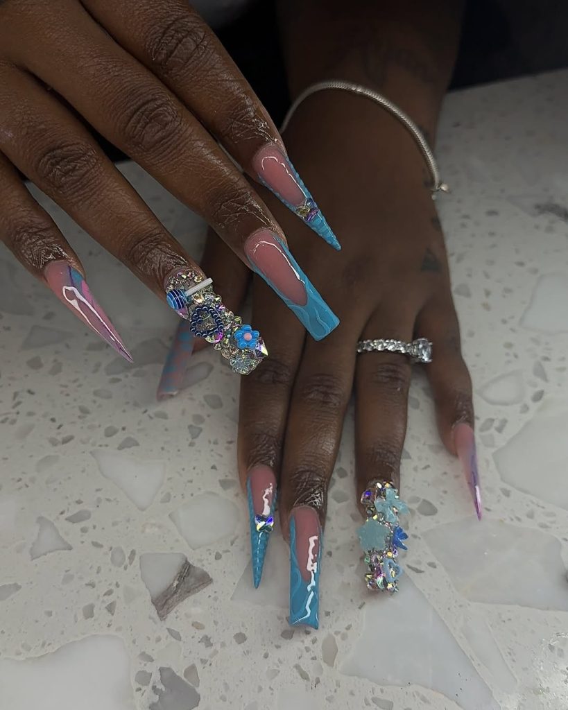 This manicure channels pure ocean vibes with bold blue tones, wave-like designs, and clusters of glittering crystals. It’s as if the sea was bottled and placed on your fingertips, sparkling under every light. The mix of sharp stiletto and coffin shapes makes the set even more daring, leaning into a bold, futuristic look.