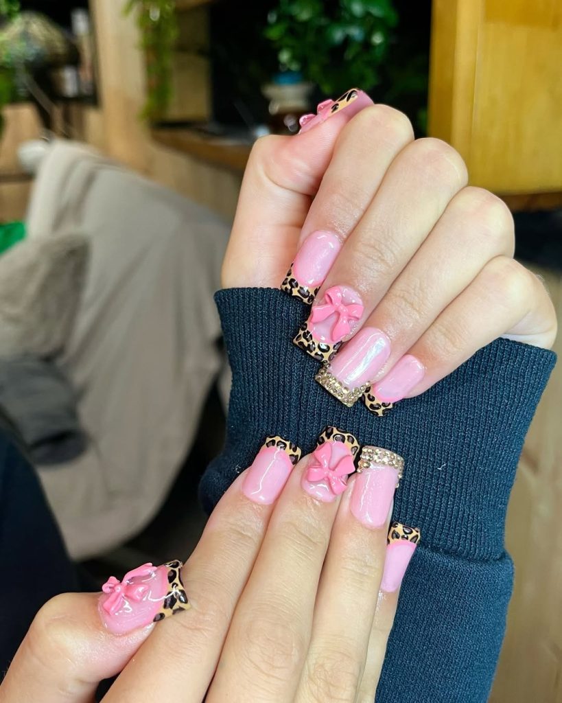 Cute and playful, these junk nails combine bubblegum pink with leopard print French tips and oversized 3D bows. It’s the perfect mix of girly and wild, making them an instant attention-grabber. The touch of sparkle adds that extra bling, giving them a fun and trendy finish.