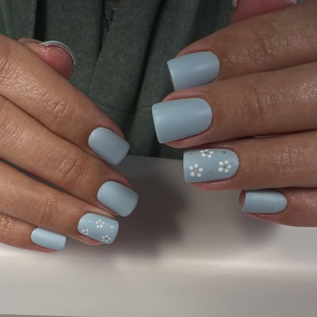 The manicure in soft blue is so euphoric and serene to look at. The design with matte finish nails is subdued and elegant with a touch of sweetness, and the floral nail design is soft and charming. The finish, floral details, and color palette evoke a serene spell. This manicure is perfect for spring. Sugary and serene. Subdued colors can be powerful and resonate deeply for spring. The design is free and lets your nails do the talking.