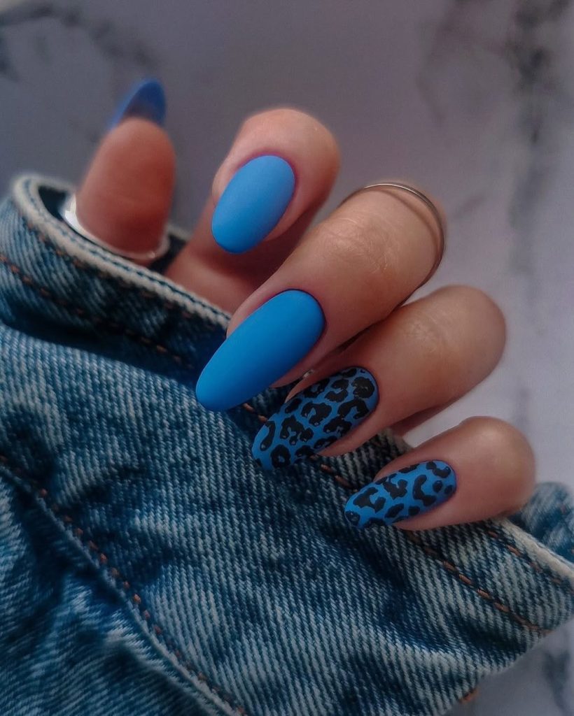 ‘Wild’ meets ‘refined’ in this bold blue matte manicure. The striking animal print gives a fun, edgy contrast to the design, while the solid blue nails add balance and depth. It’s a design that celebrates confidence—fearless and fashion-forward. The matte texture softens the color just enough to keep it wearable for everyday flair.