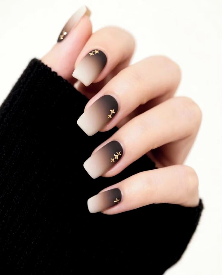 11. Black to Nude Matte Ombre with Gold Star Accents