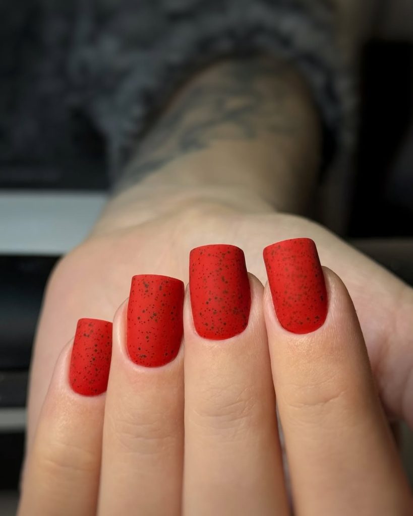 This bold matte red manicure gets a playful upgrade with a speckled black effect, giving it an artistic edge. The design feels spontaneous yet chic—like modern art meets everyday wear. It’s fiery and confident, a perfect statement for anyone who loves creative yet wearable nail looks.