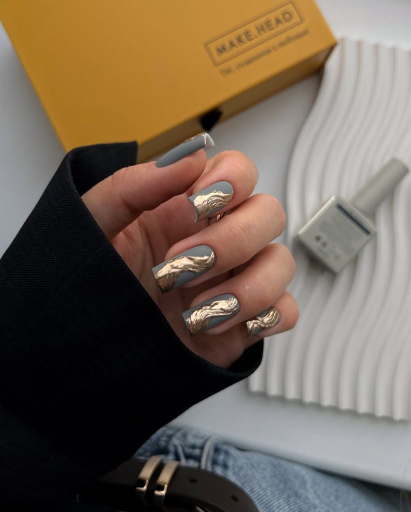 This creative matte gray manicure with gold metallic details is a visual delight, exuding a perfect blend of elegance and artistry. The juxtaposition of a cold matte finish with a rich and warm gold accent captures attention and imbues each finger with a sense of distinctiveness and character. This design is perfect for women who love to wear classy and bold art-inspired pieces and want to make a tasteful statement.