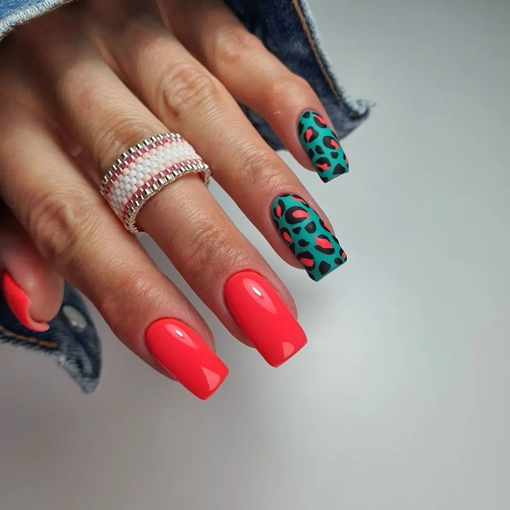 This manicure mixes bold color and wild creativity—neon coral nails paired with a teal and pink leopard design. The matte finish keeps the look balanced, softening the vivid hues for a stylish and confident appearance. It’s playful and daring, yet still wearable for anyone craving fun in their routine.