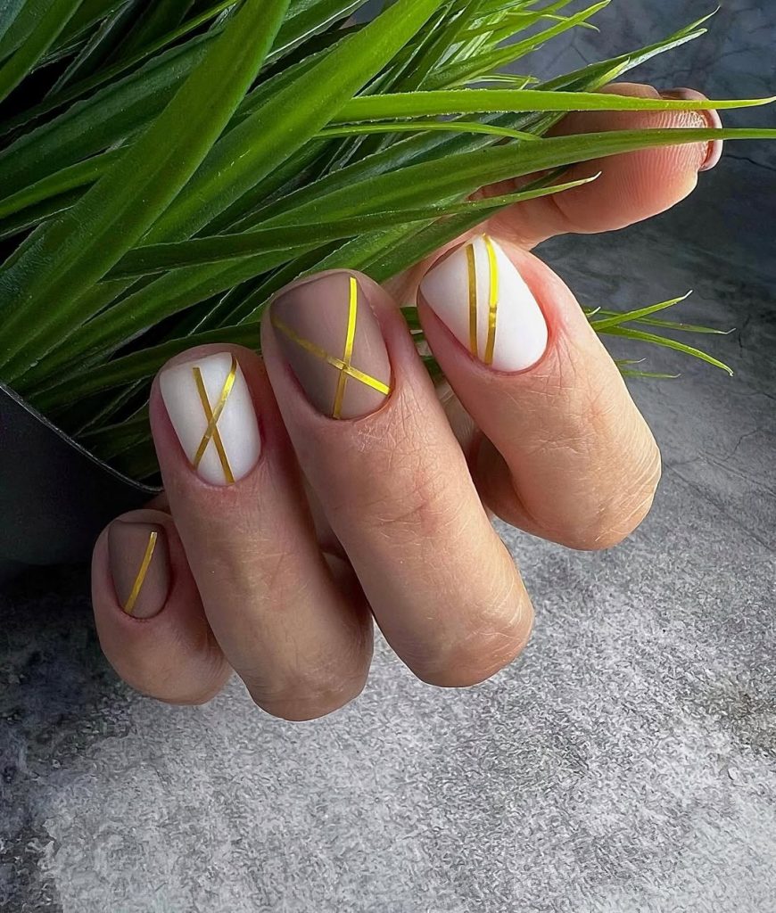 Sleek, modern, and artful—this neutral matte manicure brings together white, nude, and soft brown with metallic gold stripes that feel like jewelry for your nails. The geometric design feels both architectural and feminine, the kind of nail art that instantly elevates even a simple outfit. It’s understated luxury at its best—clean, balanced, and refined.