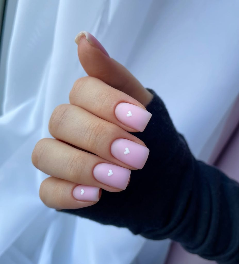 21. Soft Pink Matte Nails with Tiny White Hearts