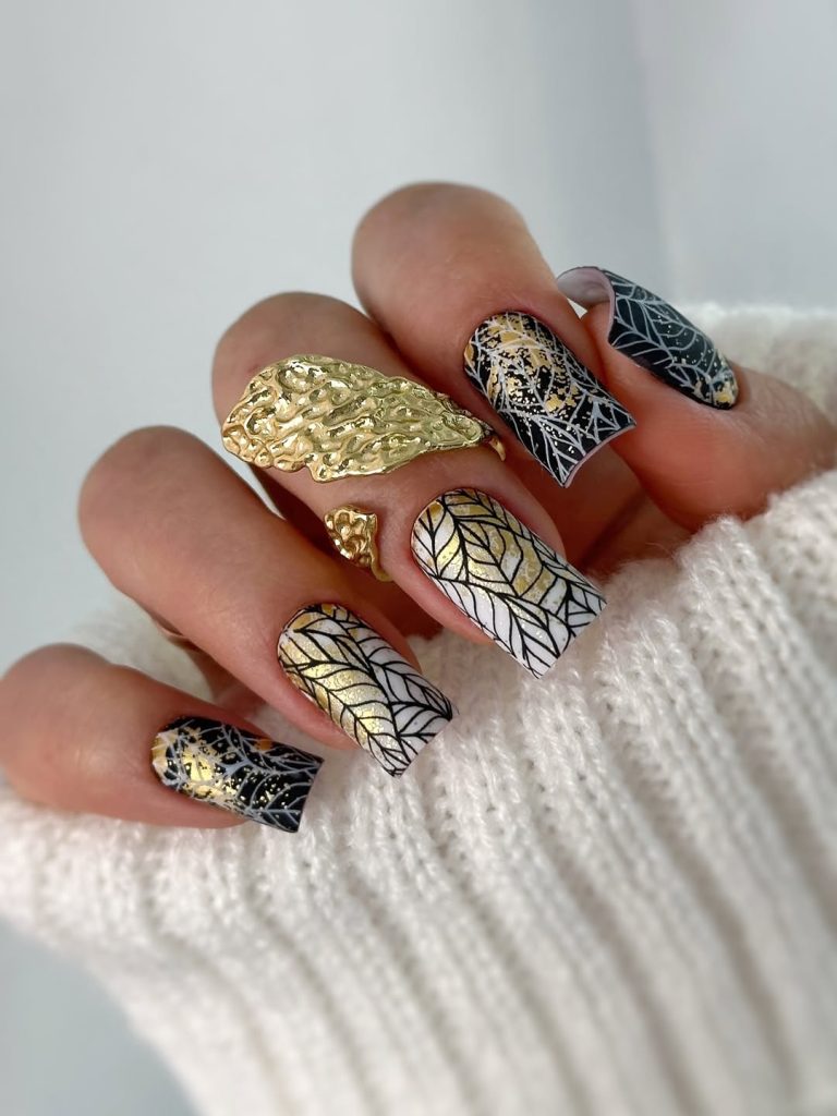 22. Matte Black and Gold Leaf Design with Modern Art Touch