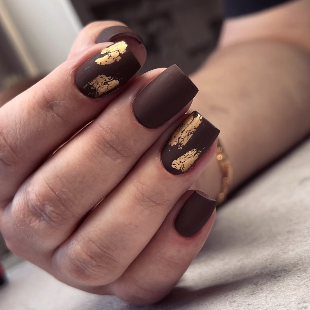 24. Deep Chocolate Matte Nails with Gold Foil Accents