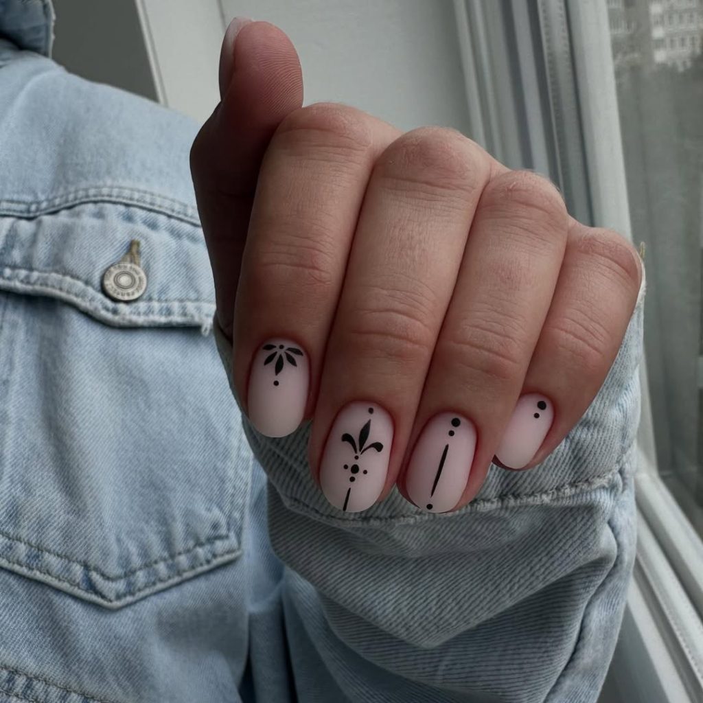 This design is a perfect example of minimalist and modern art. The nude matte base with fine black geometric art is a creative expression of artistic sophistication. The balance and structure are created through the intricate detailing with lines and dots. This design is one of the most versatile and simple matte nail ideas for 2026 for everyday use.