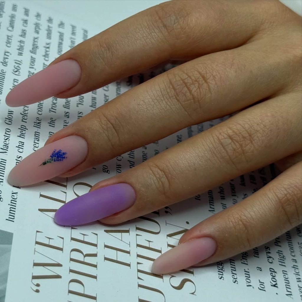 Soft pink meets muted lavender in this dreamy matte look that feels romantic but never overdone. The subtle lavender art detail gives a hint of personality—think of it as your nails wearing a tiny bouquet. The gradient from nude to purple captures that perfect transition from day to night, exuding both calm and confidence.