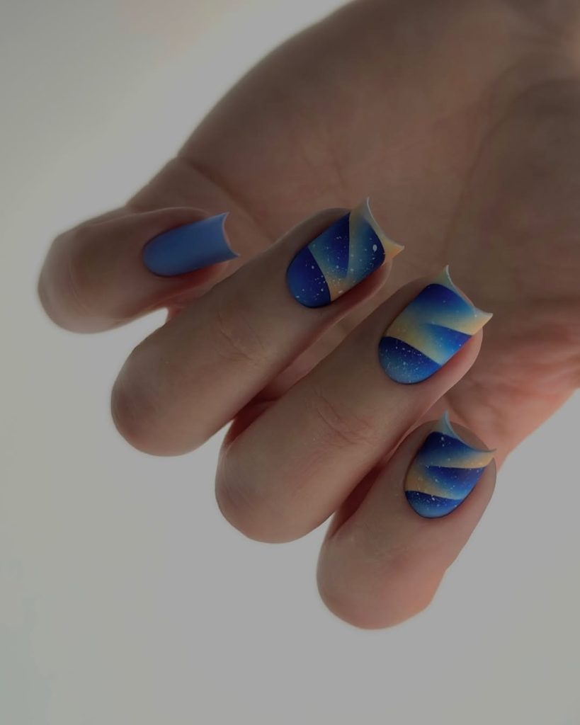 Bold yet graceful, this blue matte manicure feels like a night sky wrapped around your fingertips. The gradient of dark blue and sandy beige evokes starlit skies and ocean waves, while the tiny white specks mimic constellations. It’s artistic, mysterious, and deeply chic—a design that tells a story in color and texture.