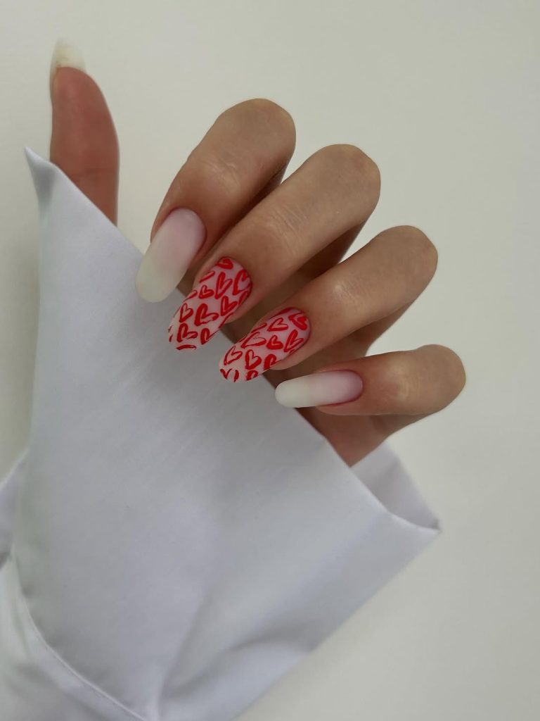 Ideal for almond acrylic nails, this design works best for women who love red art but still want something modern and wearable. It flatters medium to long nails and pairs perfectly with cozy sweaters or Valentine’s outfits. To add an extra twist, consider incorporating one accent nail with glossy tips to create contrast while maintaining the velvety matte finish.