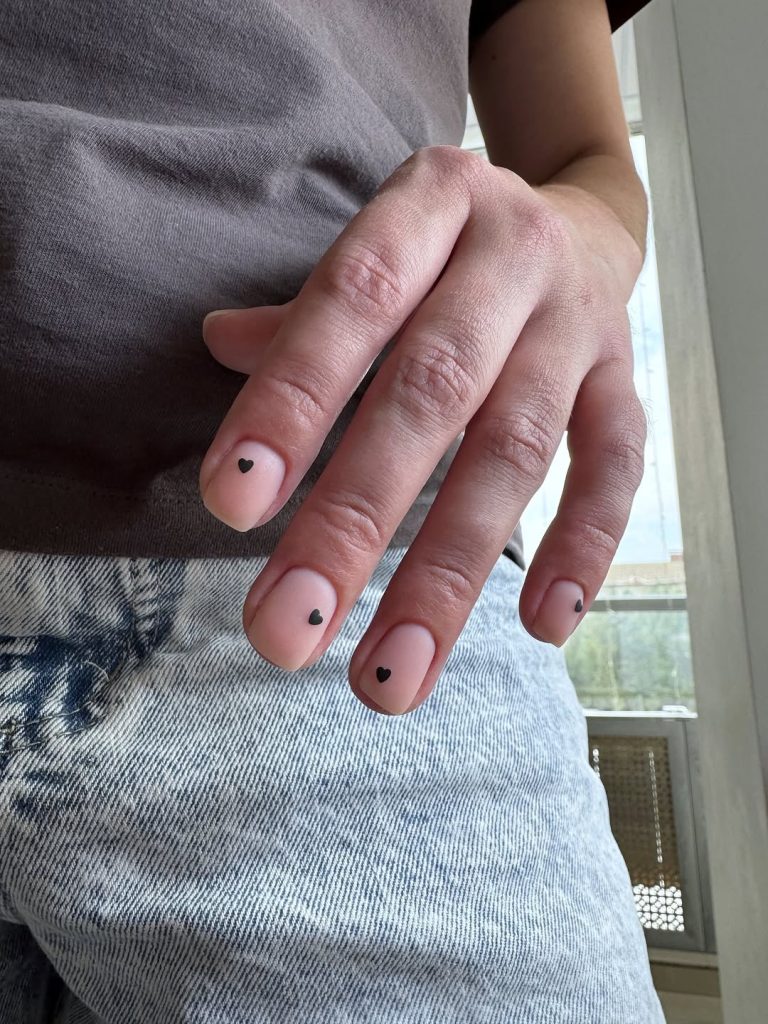 The elegance of these nude matte nails with tiny black hearts is undeniable. The minimalist design is what makes it captivating. It is simple and stands out, as it is full of romance and quiet confidence. It has a modern, intimate feel and gives off cool-girl energy.