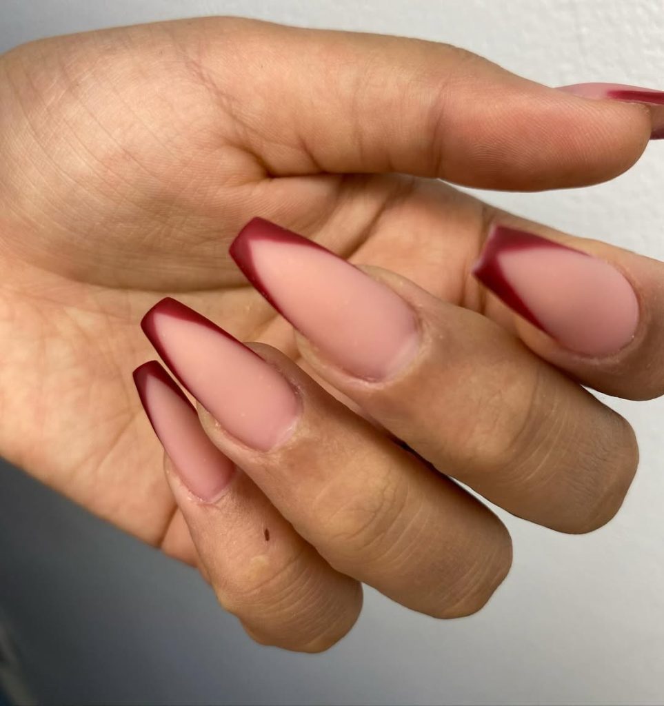 9. Burgundy Edge Matte Nails with V-Tip Design
