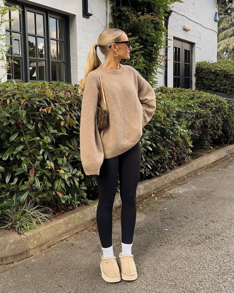 Neutral tones bring warmth to leggings styling, making this outfit feel approachable and adorable without leaning overly sporty. The muted palette works beautifully for transitional weather.