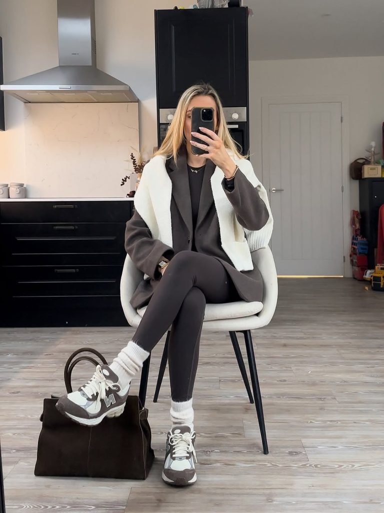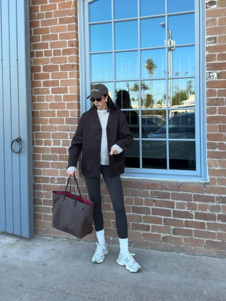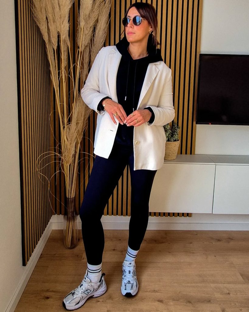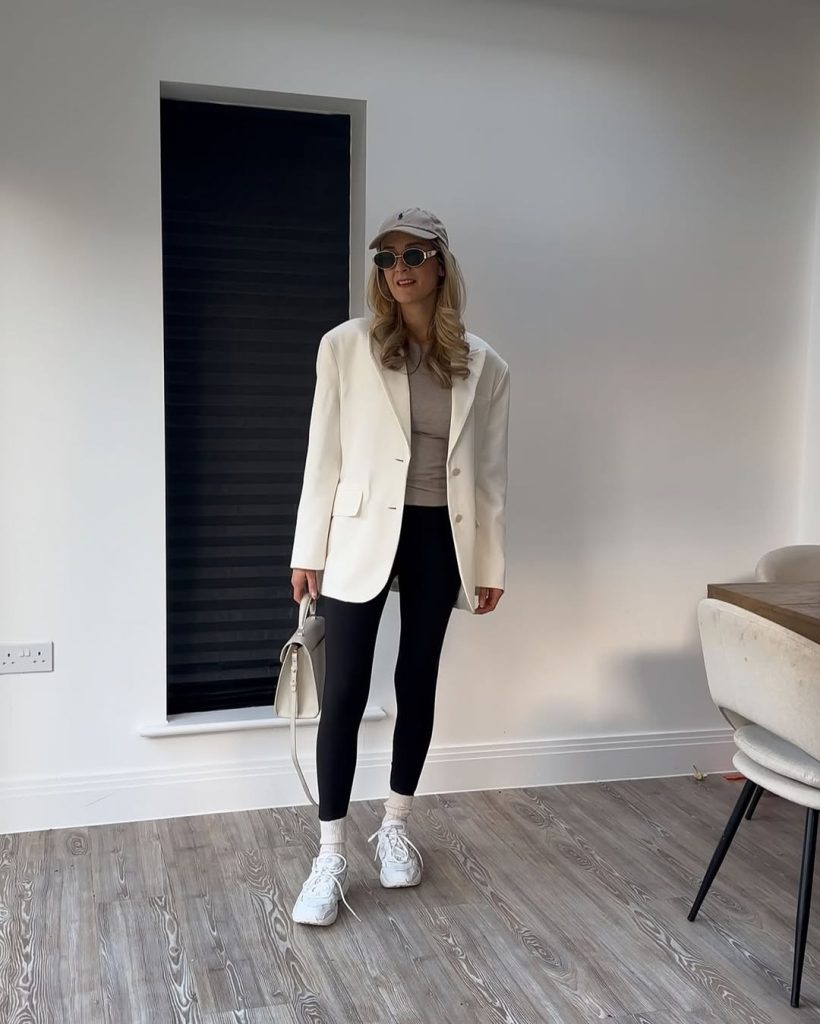 This look blends structure and comfort, proving that leggings can easily cross into casual work territory with the right layers. The contrast between tailored and relaxed pieces feels modern and intentional.