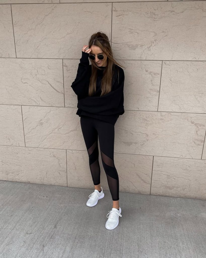 A monochrome black leggings look sets the tone for Casual 2026—minimal, sporty, and quietly confident. The oversized sweatshirt softens the fitted base, making the outfit feel effortless rather than styled.