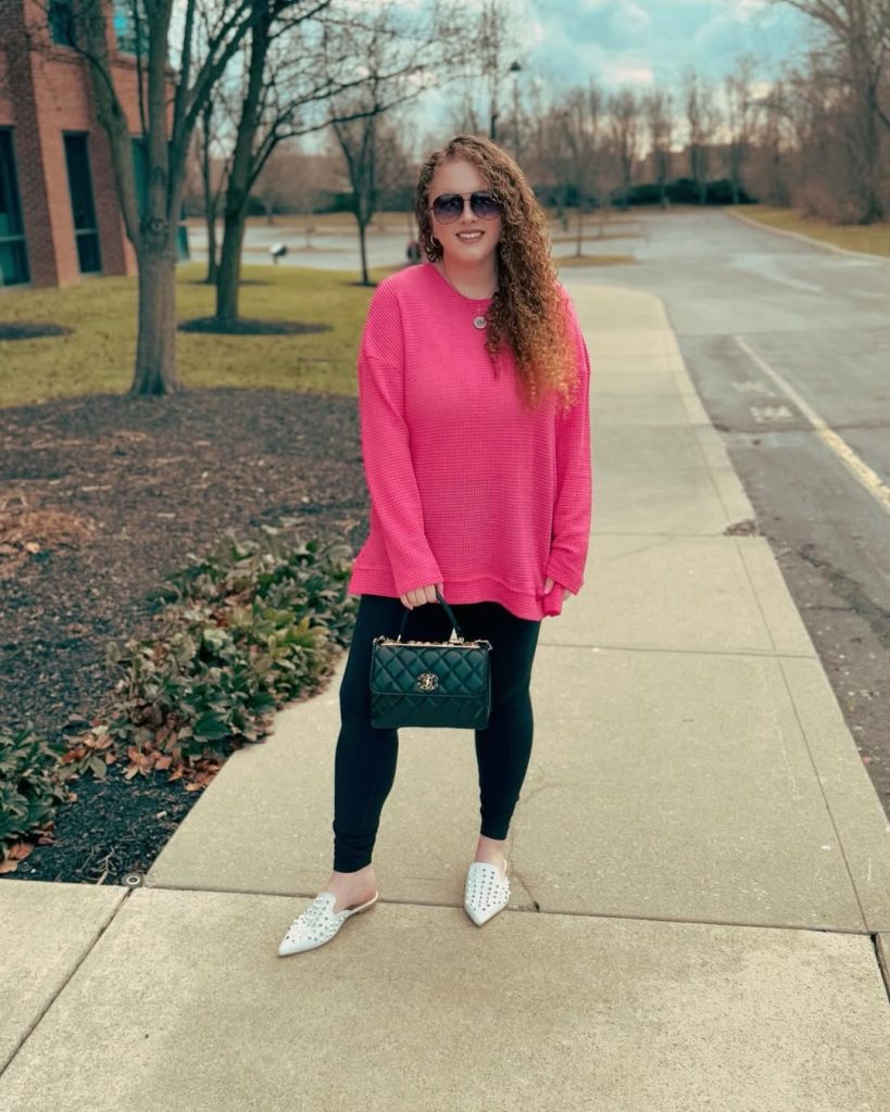 A relaxed pastel knit paired with deep-toned leggings creates a comfy, feminine look perfect for early spring walks and everyday plans.