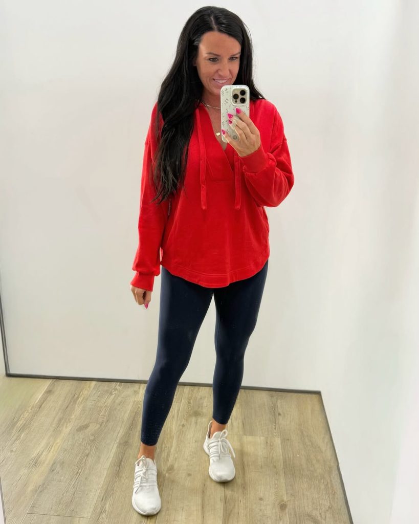 A bold red top instantly refreshes classic black leggings, creating a look that feels upbeat, confident, and easy to wear.