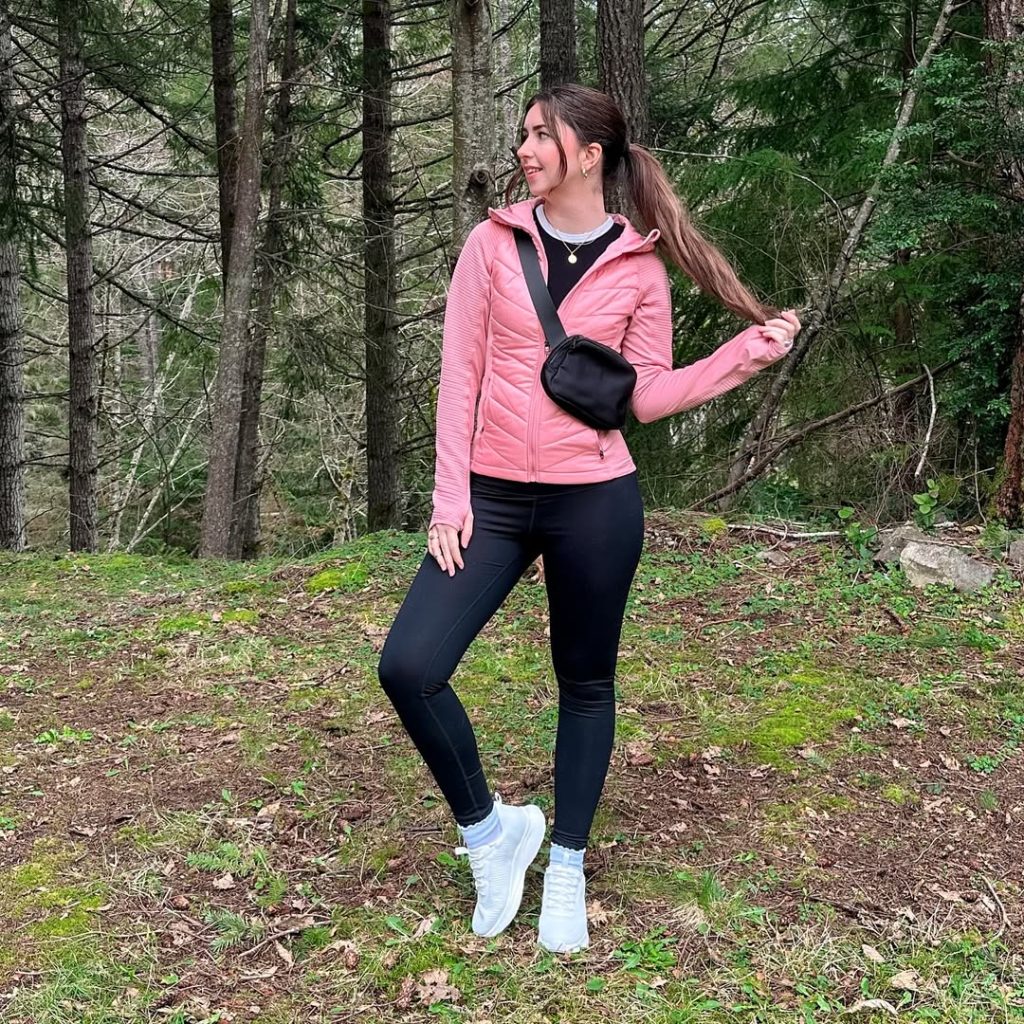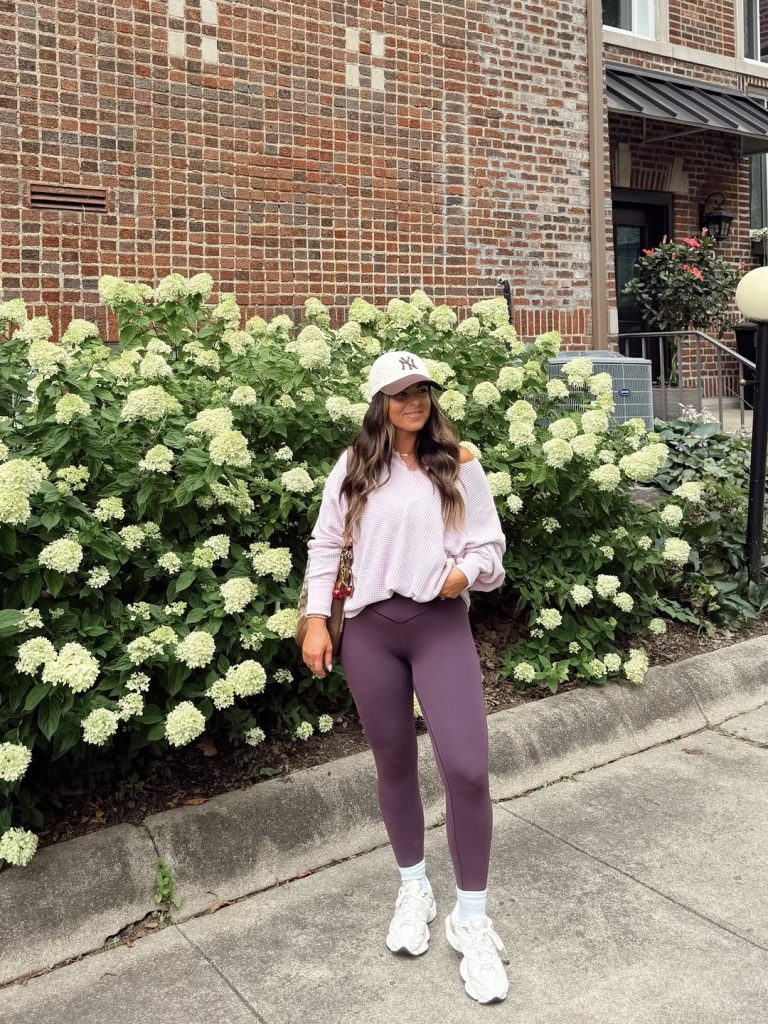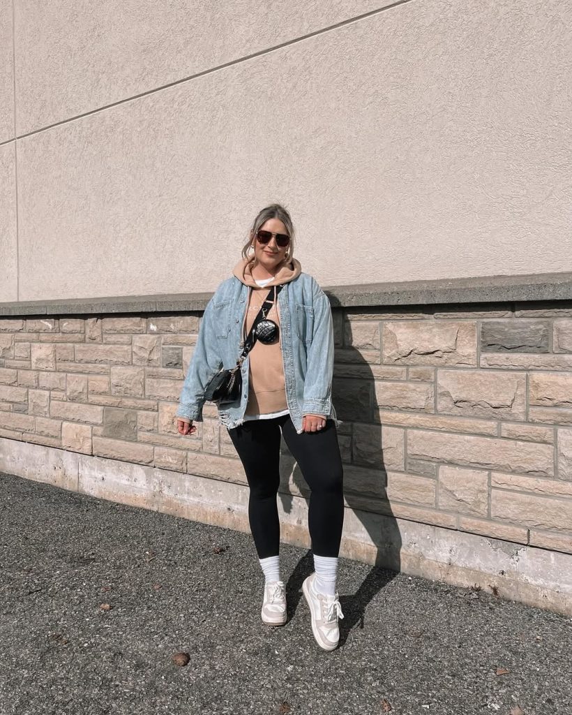 This outfit captures the practical side of modern leggings styling, blending athletic pieces with everyday wearability.