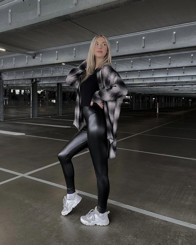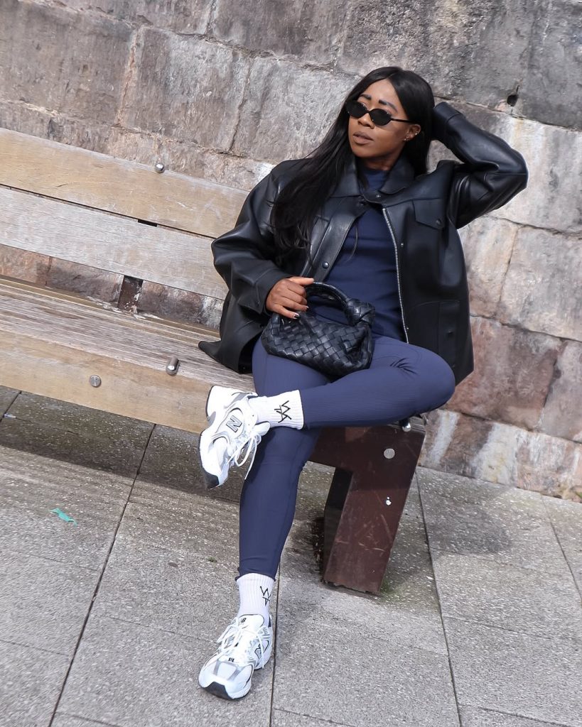 This outfit leans into confident city energy, blending structure and ease in a way that feels very 2026. Faux-leather leggings elevate the look without sacrificing comfort.