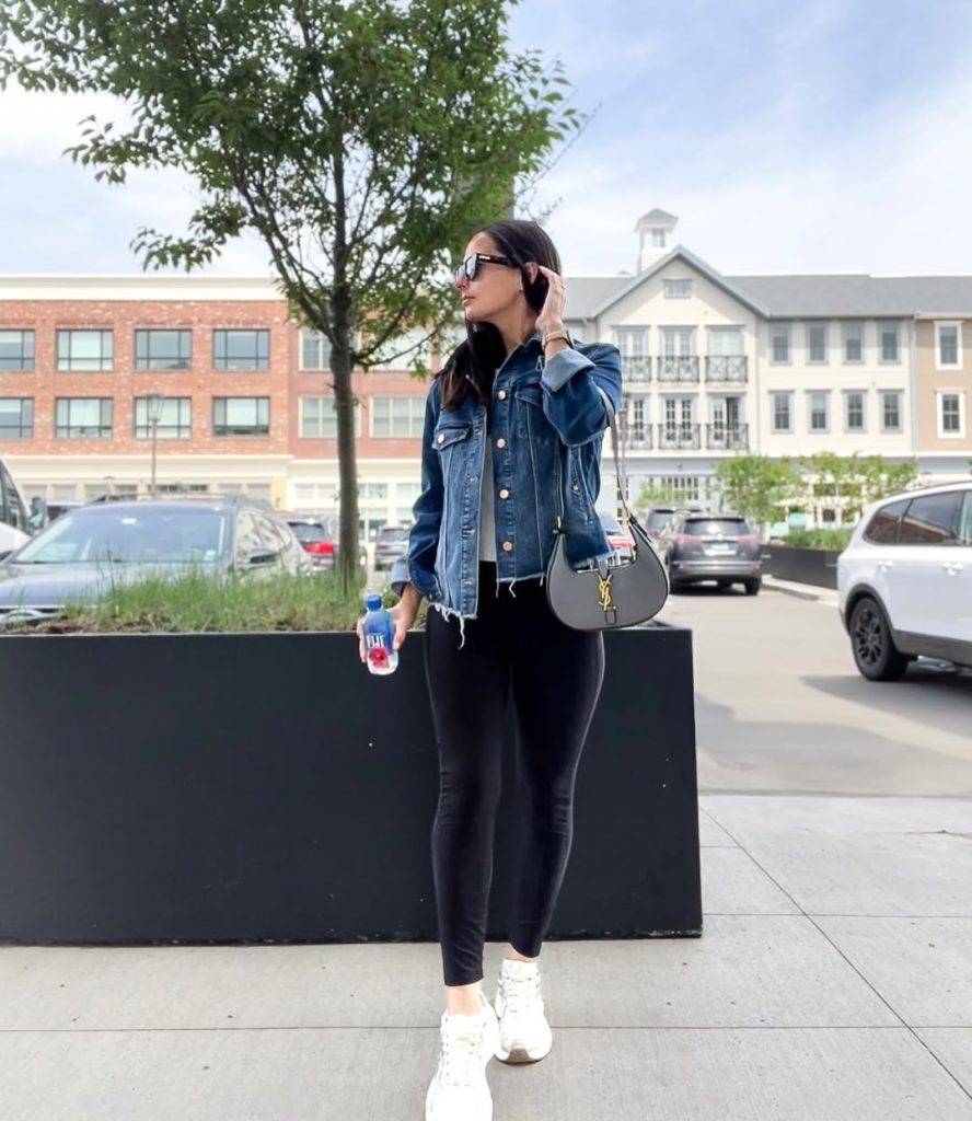 Few pieces feel as timeless as a denim jacket paired with black leggings. This look balances familiarity with ease, making it endlessly wearable.