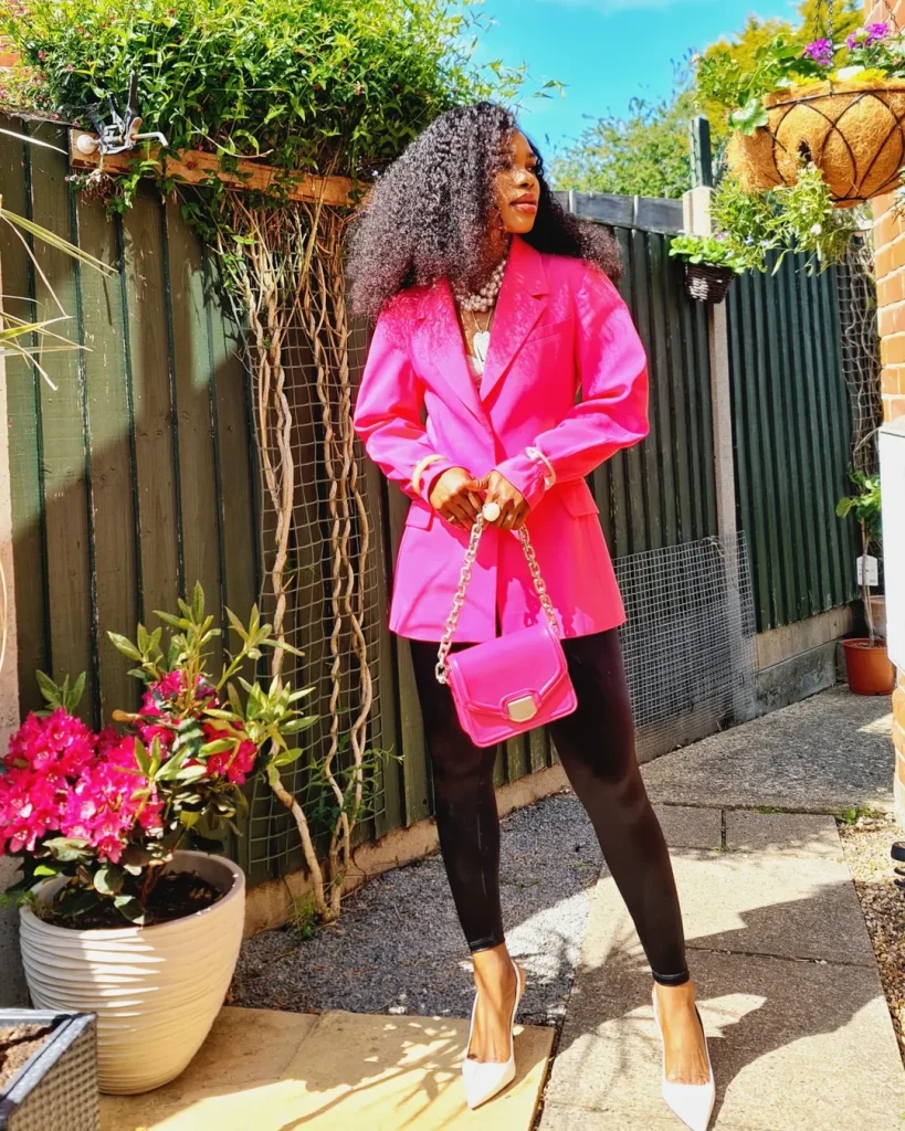 This look proves that leggings don’t have to fade into the background. A vibrant pink blazer transforms the base into something expressive and fashion-forward.