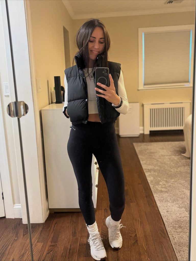 A cropped vest and sleek layers turn leggings into a sporty, cold-weather staple that feels modern and practical.