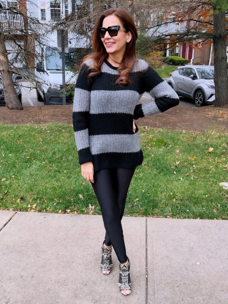 A striped sweater adds personality to sleek leggings, creating a charming, versatile outfit that transitions easily through the season.