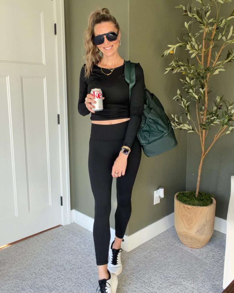 An all-black leggings outfit always delivers, especially when styled with intention. This look feels modern, flattering, and versatile across age groups.