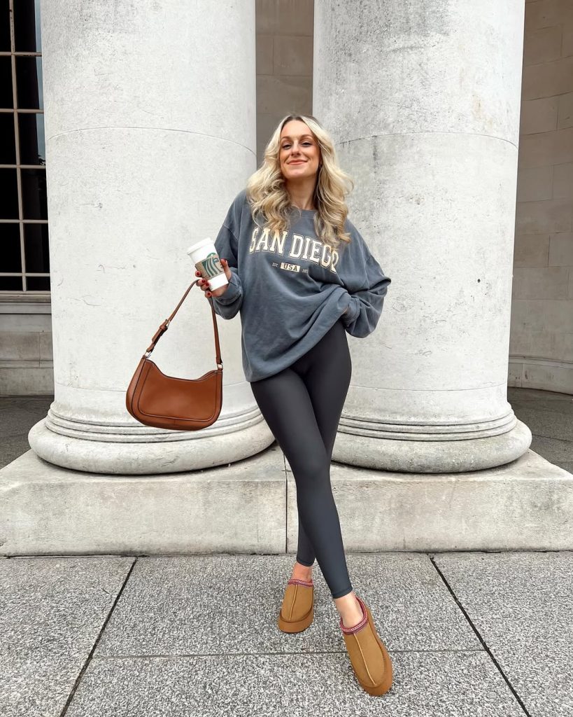 A slightly oversized sweatshirt paired with leggings creates a nostalgic, collegiate feel that’s making a strong return in casual 2026 fashion.
