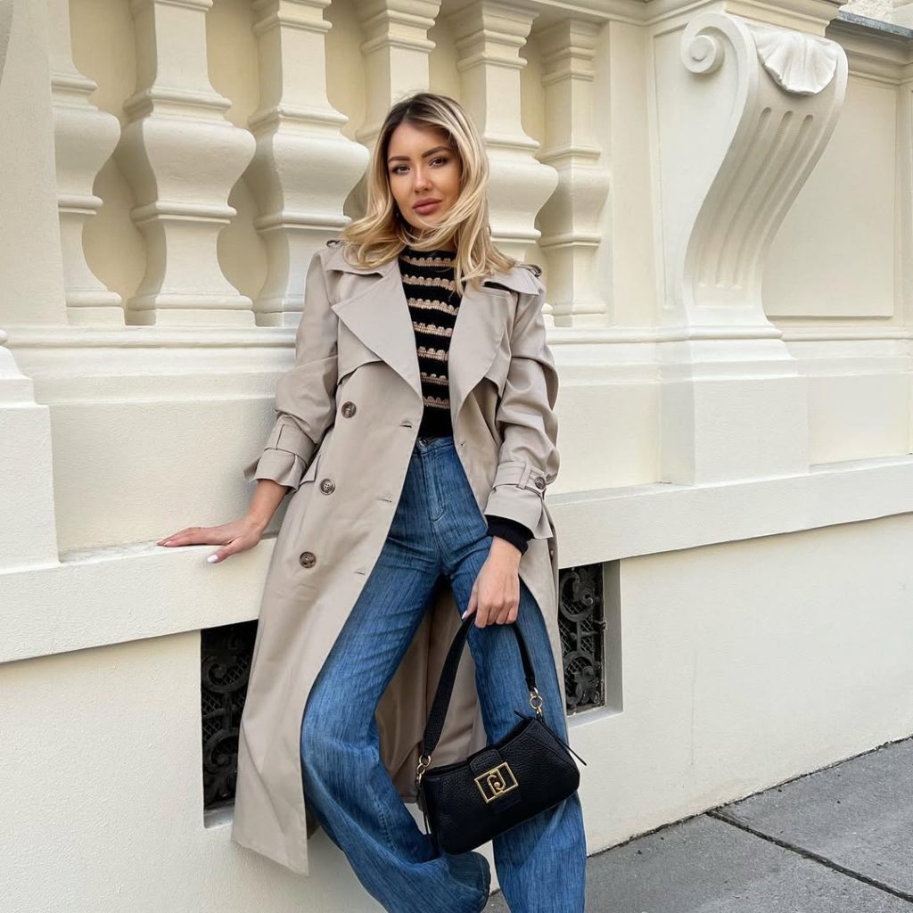 A neutral trench layered over structured jeans delivers timeless polish with modern attitude.