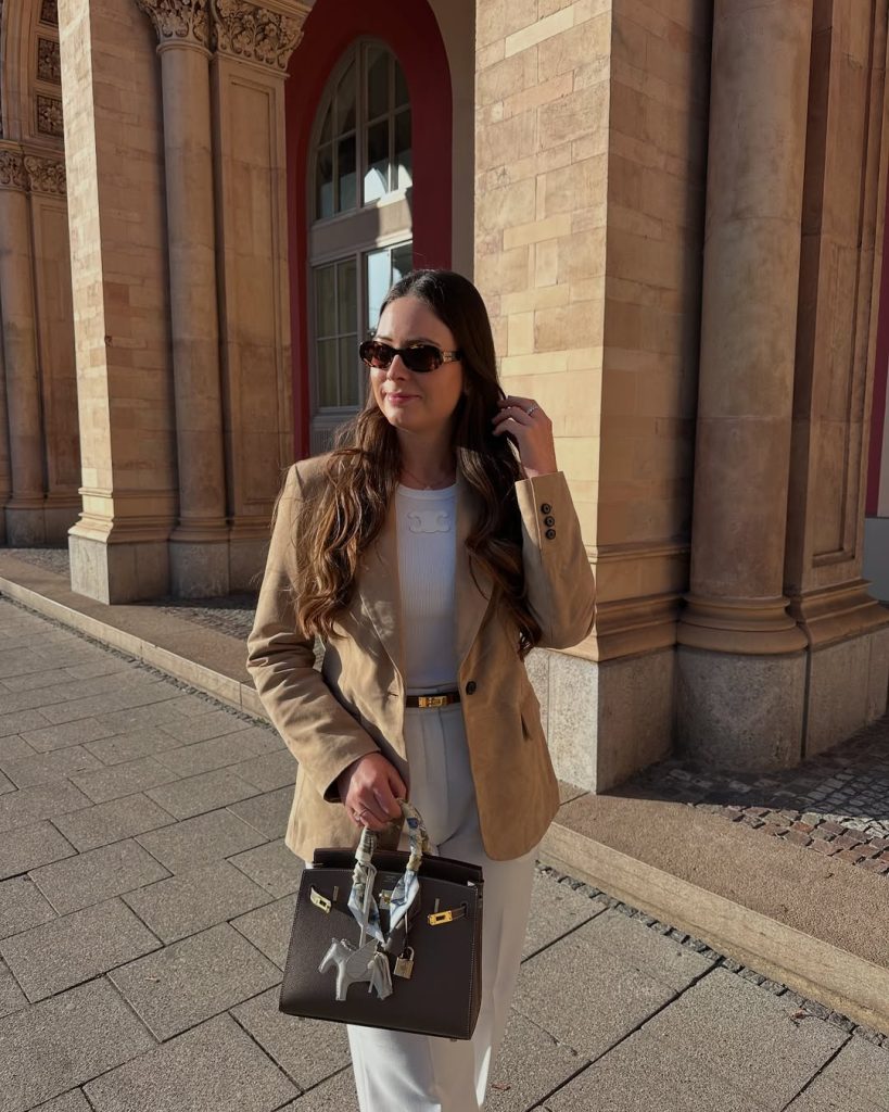 - The structured shoulder bag, with its luxury-inspired silhouette, completes the look.