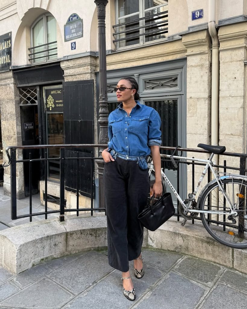 This is an everyday uniform done right—school drop-offs, casual meetings, or weekend walks. It’s cool, modest, and endlessly adaptable. Roll the sleeves for warmth as the day shifts. Avoid distressed denim here; clean lines keep it classy and timeless.