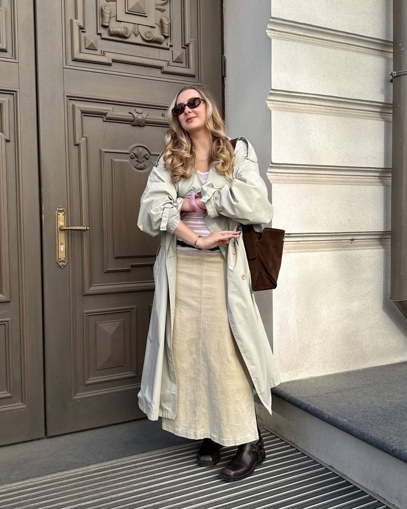 Lean into the softness with delicate jewelry and natural makeup. Avoid harsh black accessories that interrupt the pastel harmony. This outfit shines for strolls, museum visits, or rainy spring days when elegance meets practicality.