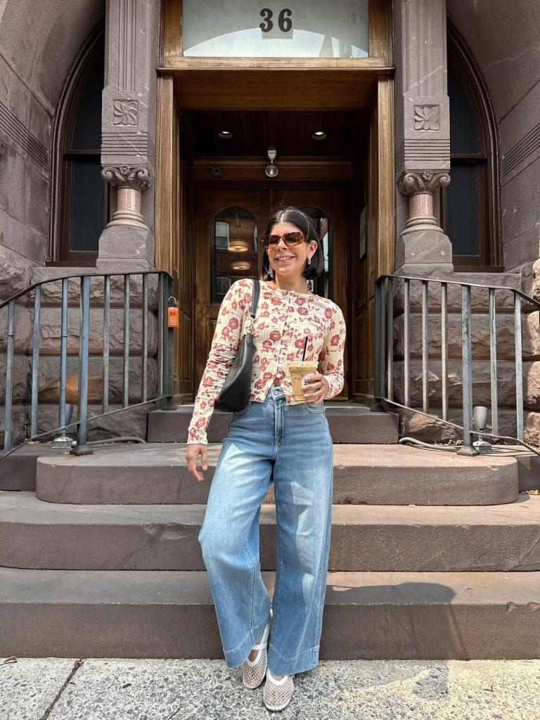 A fitted floral cardigan and flared denim capture playful inspo with everyday wearability.