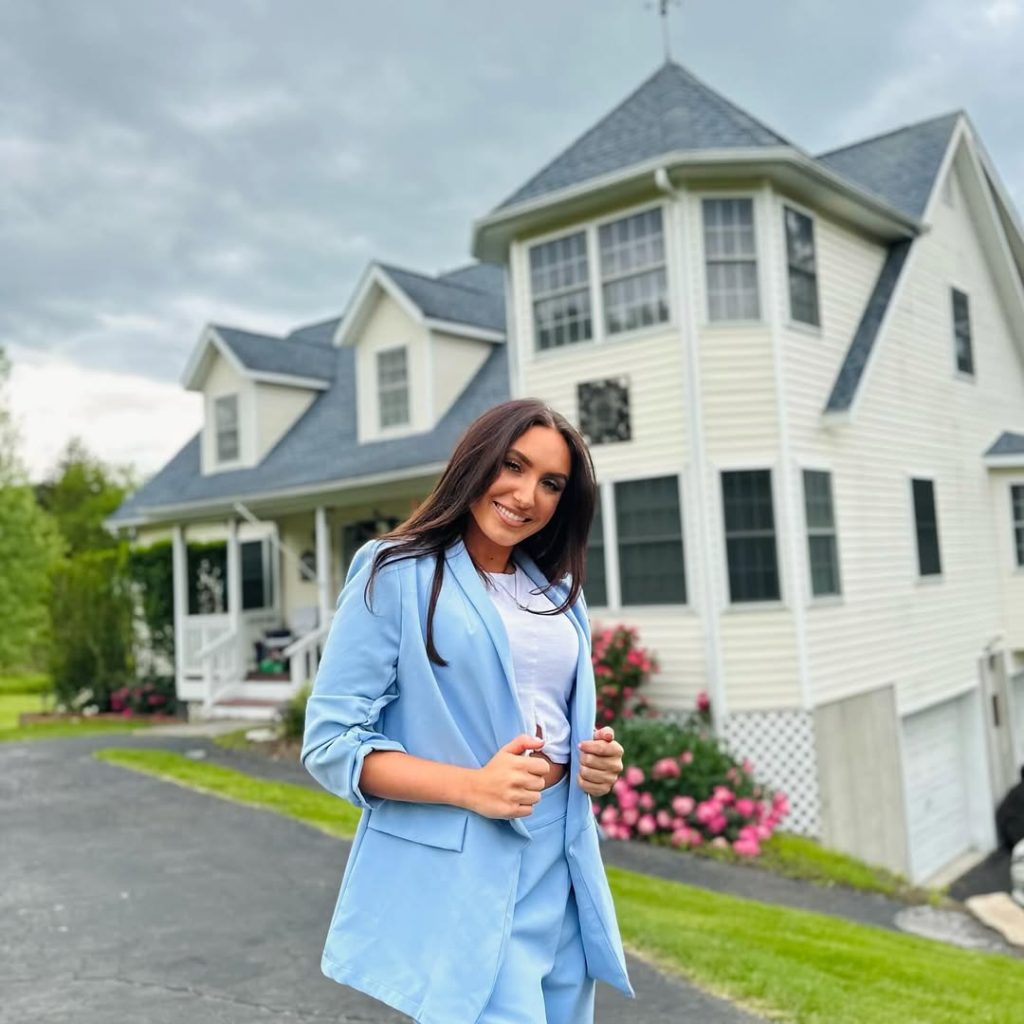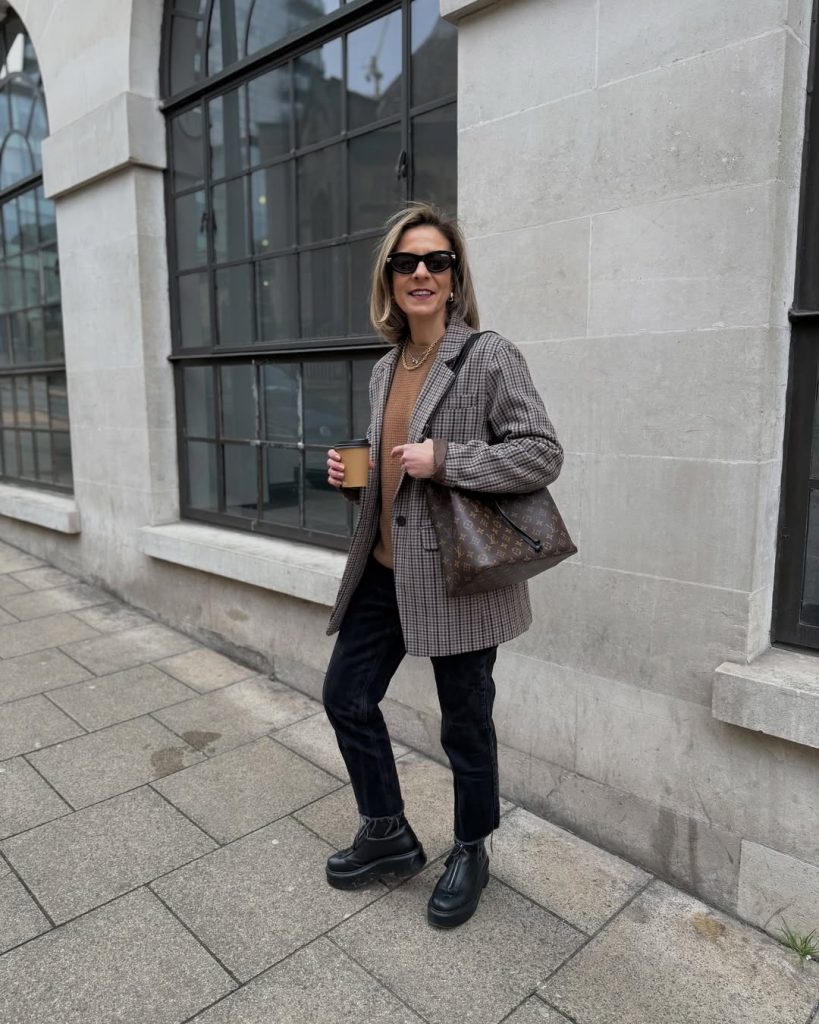 A plaid blazer over sleek black pieces proves that mothers in their 40s can master modern tailoring with ease.