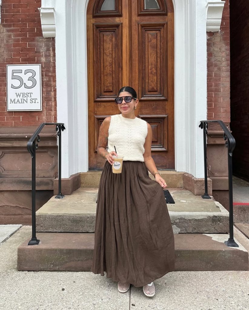 A sleeveless knit paired with a flowing skirt creates a timeless, classy look that feels calm, grounded, and thoughtfully styled.