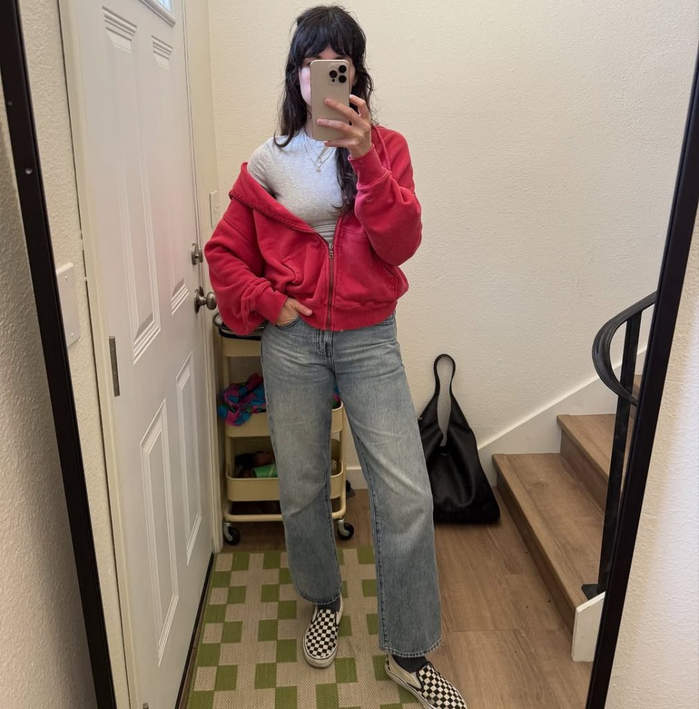 A zip-up hoodie layered over a fitted tee offers a relaxed, sporty look made for movement and long days.