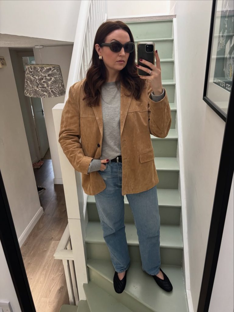 - Tan suede blazer, structured but relaxed